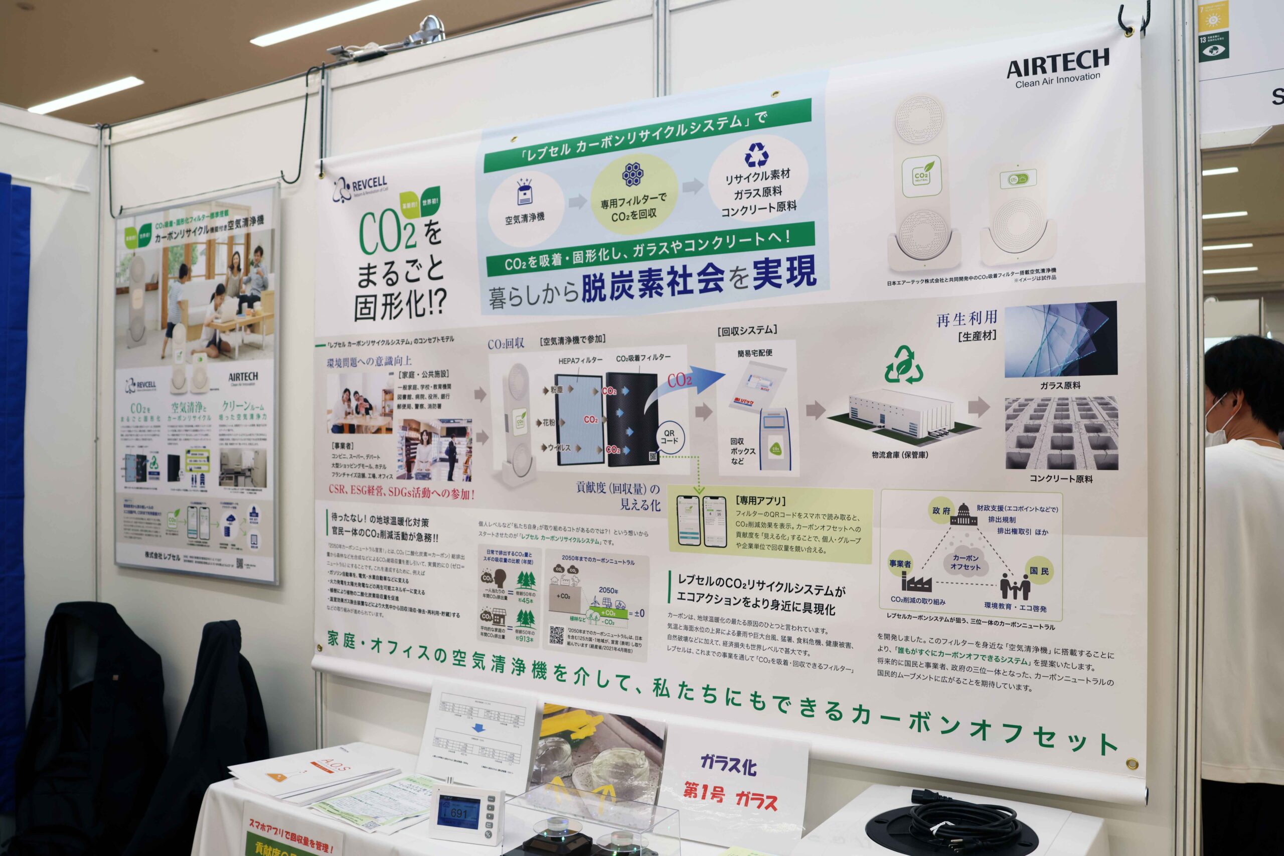 タペストリーは、基礎小間の壁面に合わせ、ギリギリまで大きく制作できるので、ちょっとした壁面パネルとしてソリューション全体像を表現できます。
